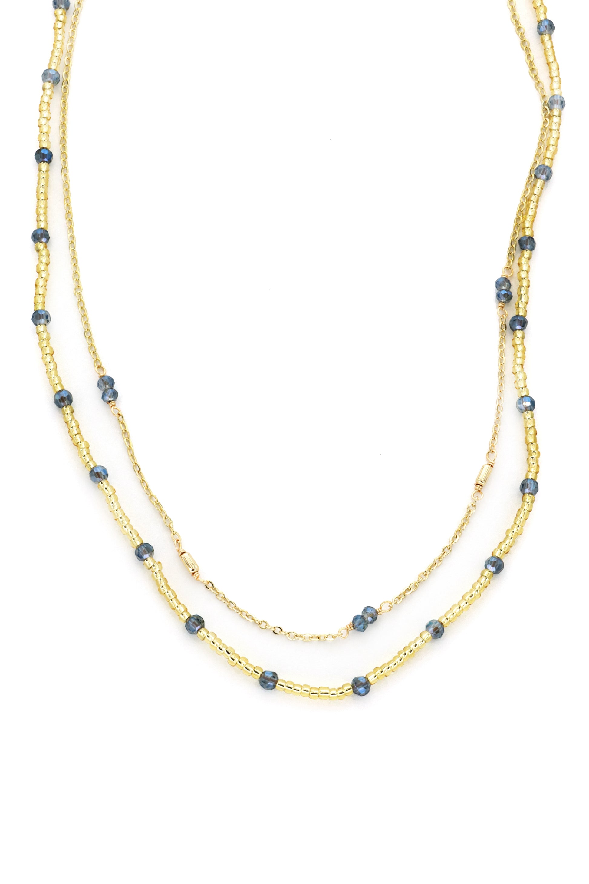 Elevate your style with our gorgeous Golden Bead Necklace. Featuring stunning sapphire blue beads and a luxurious gold tone, this versatile piece adds elegance to any look.