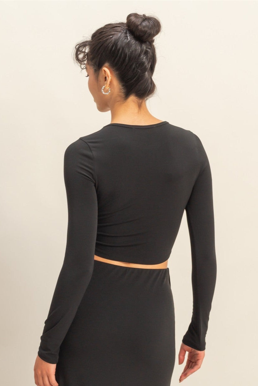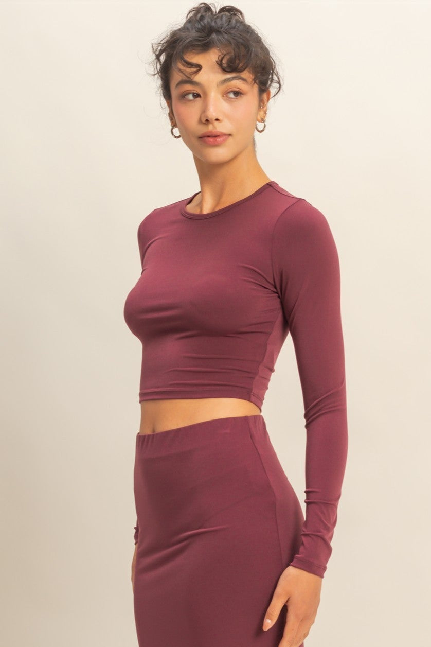 The Luxe Crop Top blends comfort and style with a sleek, fitted silhouette and classic crew neckline. Designed with long sleeves and soft, stretchy fabric, it’s the perfect piece to dress up with a skirt or keep casual with denim.
