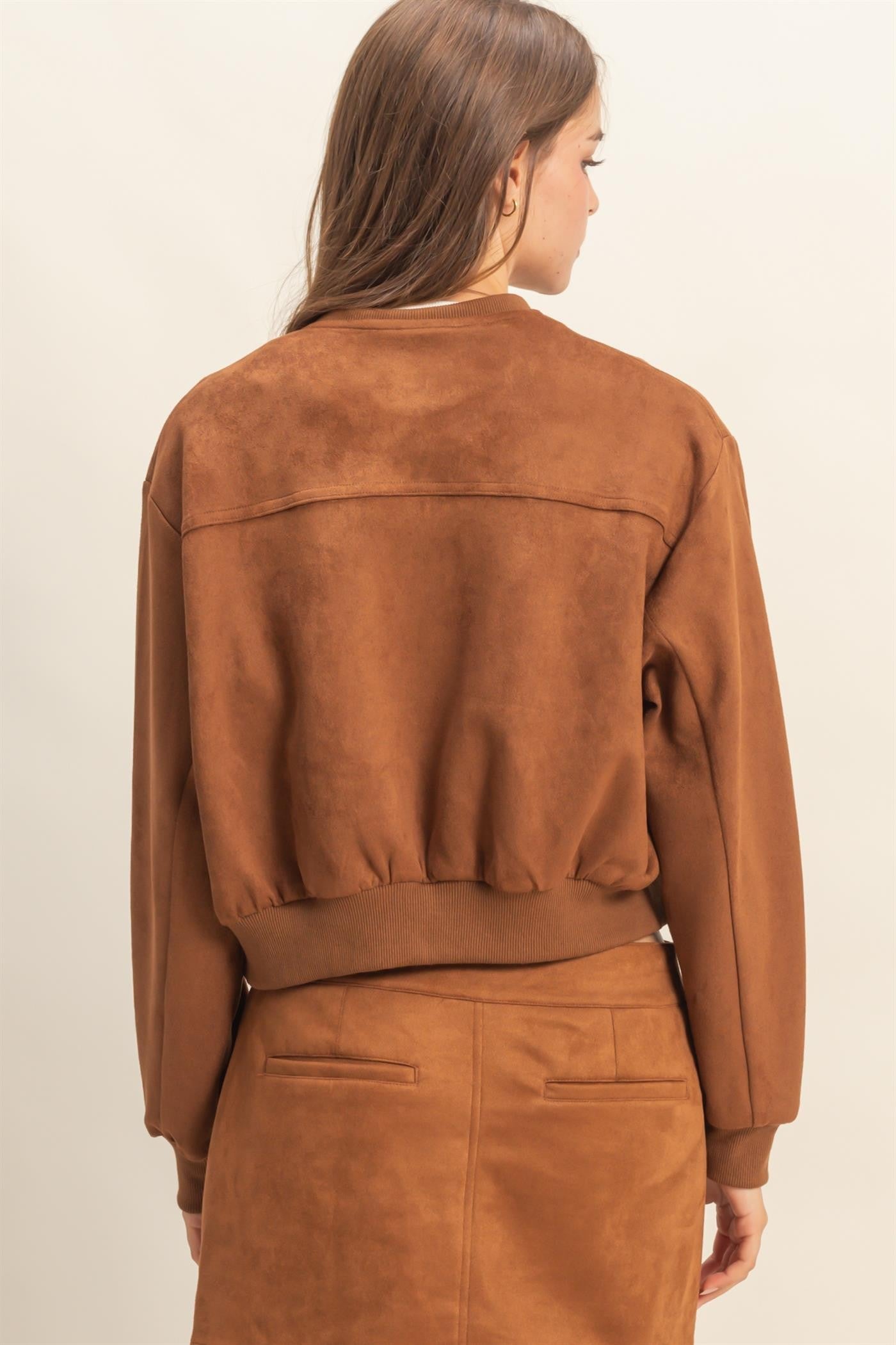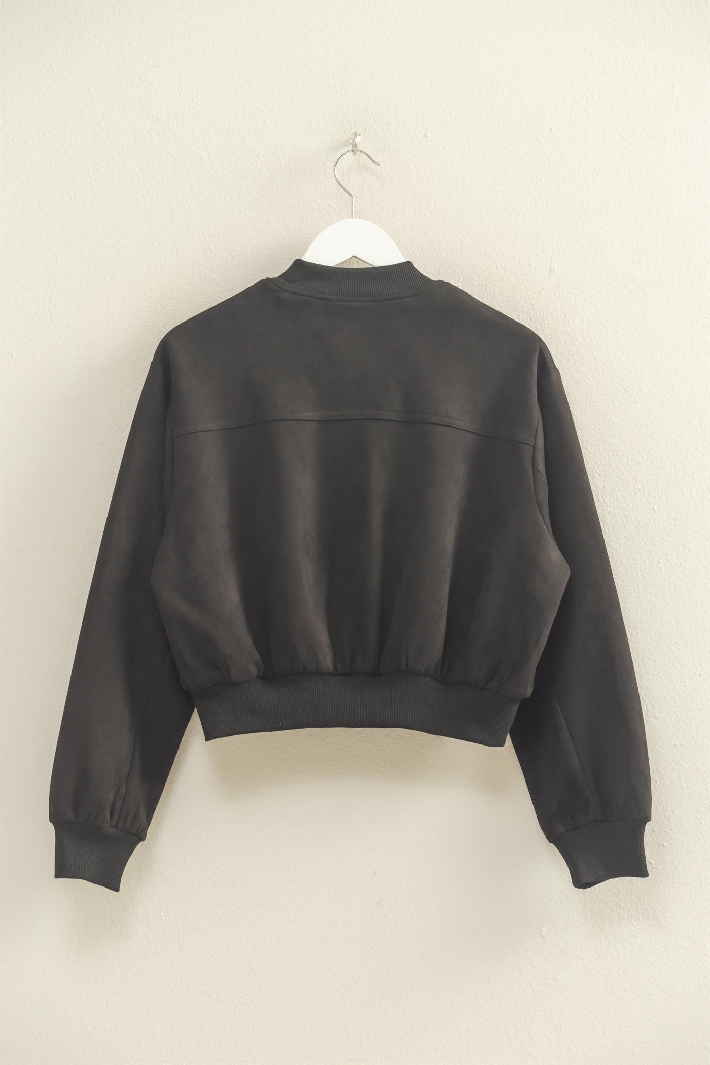 A modern take on the bomber, this suede full-zip jacket adds sleek sophistication to any look. Its soft finish and lightweight design make it perfect for layering, whether styled casually with denim or dressed up with chinos.