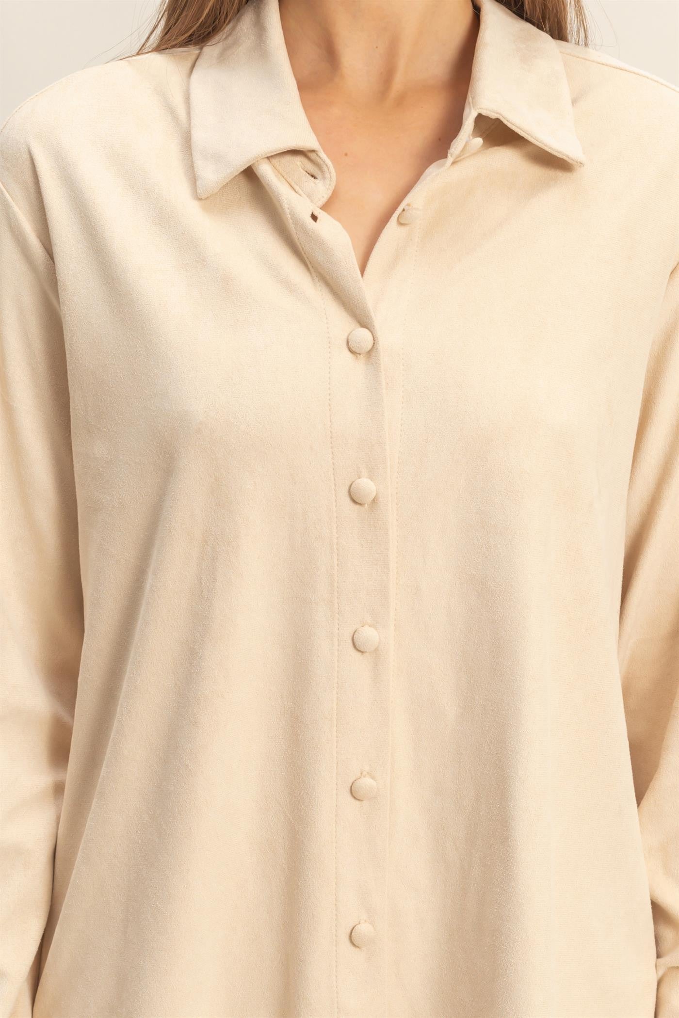 A soft suede button-up shirt that blends effortless charm with polished style. Its flowy texture drapes beautifully, creating a flattering silhouette that transitions seamlessly from day to night. Pair with jeans for casual chic or tuck into a skirt for a semi-formal edge.