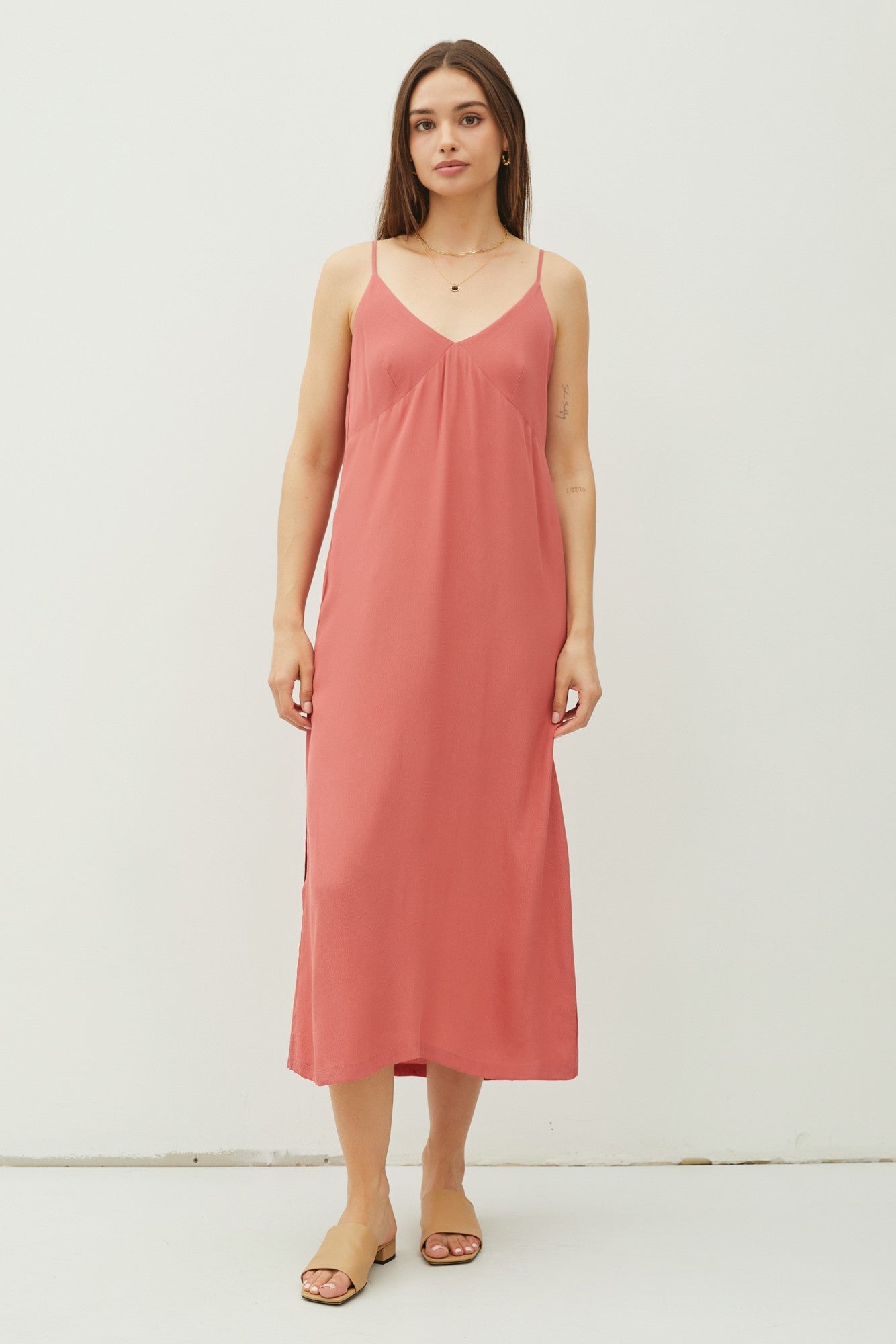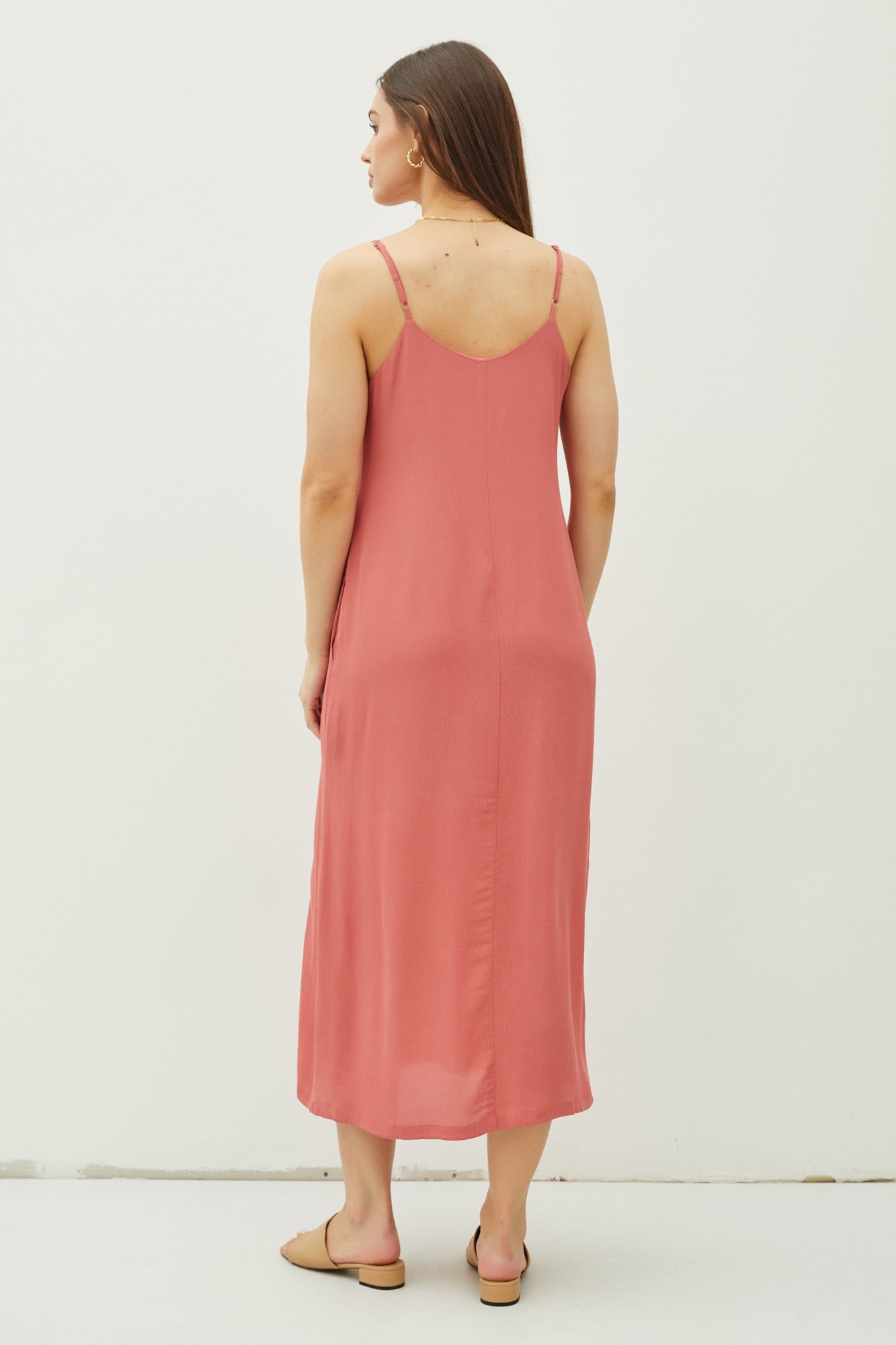 Satin Rose dress in midi length with a flattering v-neckline, flowy and relaxed fit. Features inseam pockets, adjustable spaghetti straps, and a side slit on the left side. A perfect addition to your wardrobe.